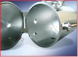 T-M Vacuum Products’standard line of Super Series™ Smart-Jar Bell Jar and Collar-Type Coating Systems are available with internal chamber sizes ranging from 18 to 48 inches diameter and up to 48-inches high. Our base size Smart-Jar bell jar measures 24-inches diameter × 30-inches high (with a usable internal volume of 7.88 cubic feet) and the bell jar chamber and all its components are manufactured from 304L stainless steel with a number 4 electro-polished finish on all inner and outer surfaces. The jar’s true “dual wall” design ensures the vacuum chamber receives 100% uncompromised water-cooling with no risk of leak from damaged cooling channels or tubing lines. Each bell jar system is mounted to a stainless steel “O” ring-sealed base plate that incorporates all necessary pumping ports and feedthroughs required for operation. 4-inches ports with manually operated shutter assemblies provide viewing access. The Smart-Jar Series bell jar features a main, “self-centering” split seal located in the center of the jar that divides the jar in half for more efficient cleaning and foiling. The lower portion of the jar rests on the base plate during operation and can be lifted by an integrated hoist when cleaning and/or maintenance is required. Single or multiple source electron-beam, thermal evaporation, magnetron sputtering and cathartic arc coating sources are available along with a choice of single or multiple cryogenic, turbomolecular or ion sublimation vacuum pumps to achieve high vacuum process environments. All sources incorporate independent shutter systems and each electron beam source is mounted on an adjustable “stage” assembly located at the base plate of the bell jar chamber. The stage assembly allows each source to move freely in a 90° arc and can be raised or lowered to allow true source-to-substrate distance characterization for a more uniform coating. Multiple sputtering sources can be configured for sequential or co-deposition film processes in a vertical, horizontal, up, down and/or conical sputtering configuration.